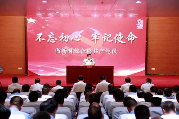 江苏省公安厅党委委员、副厅长、常州市副市长、公安局长常和平以“不忘初心,牢记使命”的主题为广大民警上了一堂生动的党课。图片来源:常州日报