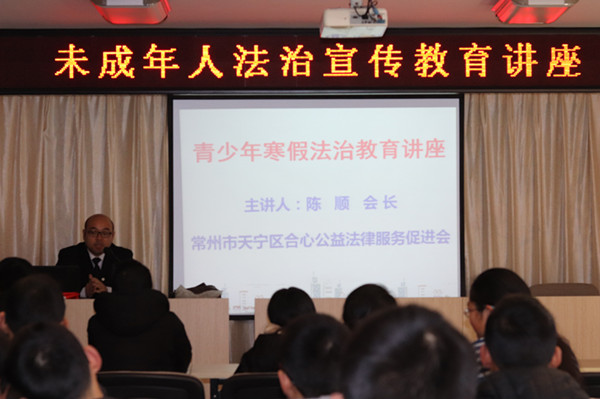 2月13日下午,丽三社区所属社会常州市天宁区合心公益法律服务促进会受丽二社区的邀请,给辖区范围内的未成年学生开展寒假法治教育讲座。本次讲座由常州市天宁区合心公益法律服务促进会会长陈顺律师主讲。